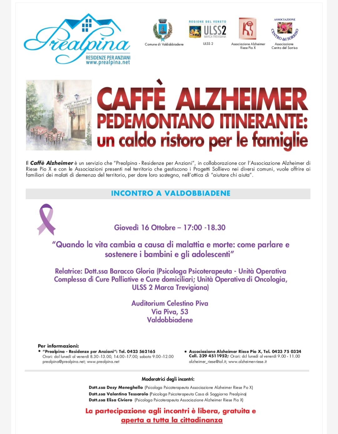 Nel contesto del Caffè Alzheimer Pedemontano itinerante, questo mese con il prezioso contributo della Dott.ssa Gloria Angela Baracco (Psicologa Psicoterapeuta - Unità Operativa Complessa di Cure Palliative e Cure Domiciliari; Unità Operativa di Oncologia, Ulss 2), avremo modo di comprendere meglio come i bambini e gli adolescenti vivono, dalla loro prospettiva, l'esperienza della malattia e della morte e in che modo può essere più utile accompagnarli e sostenerli nell'attraversamento del dolore legato al lutto e ancor prima alla perdita progressiva della relazione a causa dei molteplici cambiamenti involutivi a cui la persona con demenza va incontro nel corso della sua malattia.